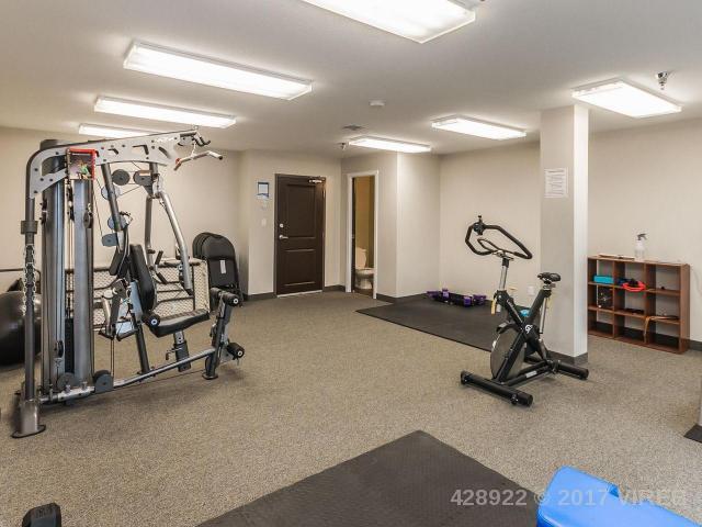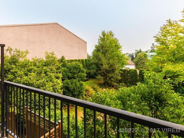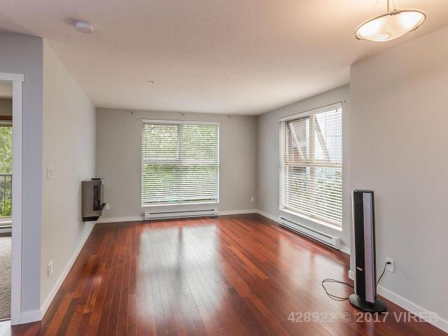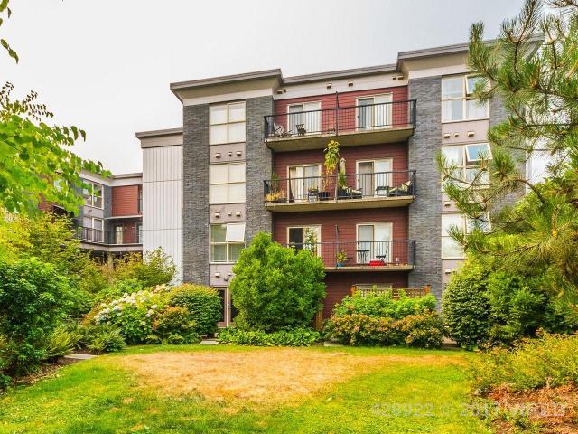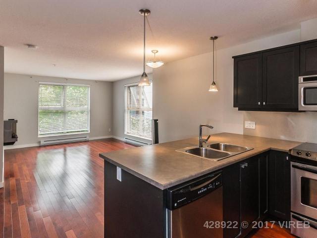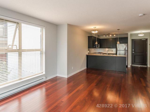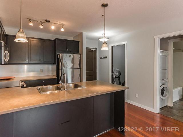 Stylish open concept 1 bedroom + den European style condo with balcony is just steps from the charming old city quarter of Nanaimo. Modern designed 9 year old concrete and steel building with views of a beautiful central courtyard. The beautiful kitchen is upgraded with stainless steel appliances and rich maple cabinetry, with full sized island/eating bar. Engineered hardwood flooring, large bright thermal windows, electric fireplace and in suite washer and dryer. Freshly painted and meticulously maintained makes this unit feel new. Easy to rent, excellent strata with affordable fees, close to university, sea wall, shopping and main bus terminal minutes away. Added features include storage, secure underground parking for 1 car (with street parking available), new upgraded fitness room and onsite security.