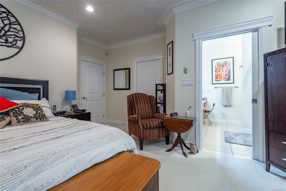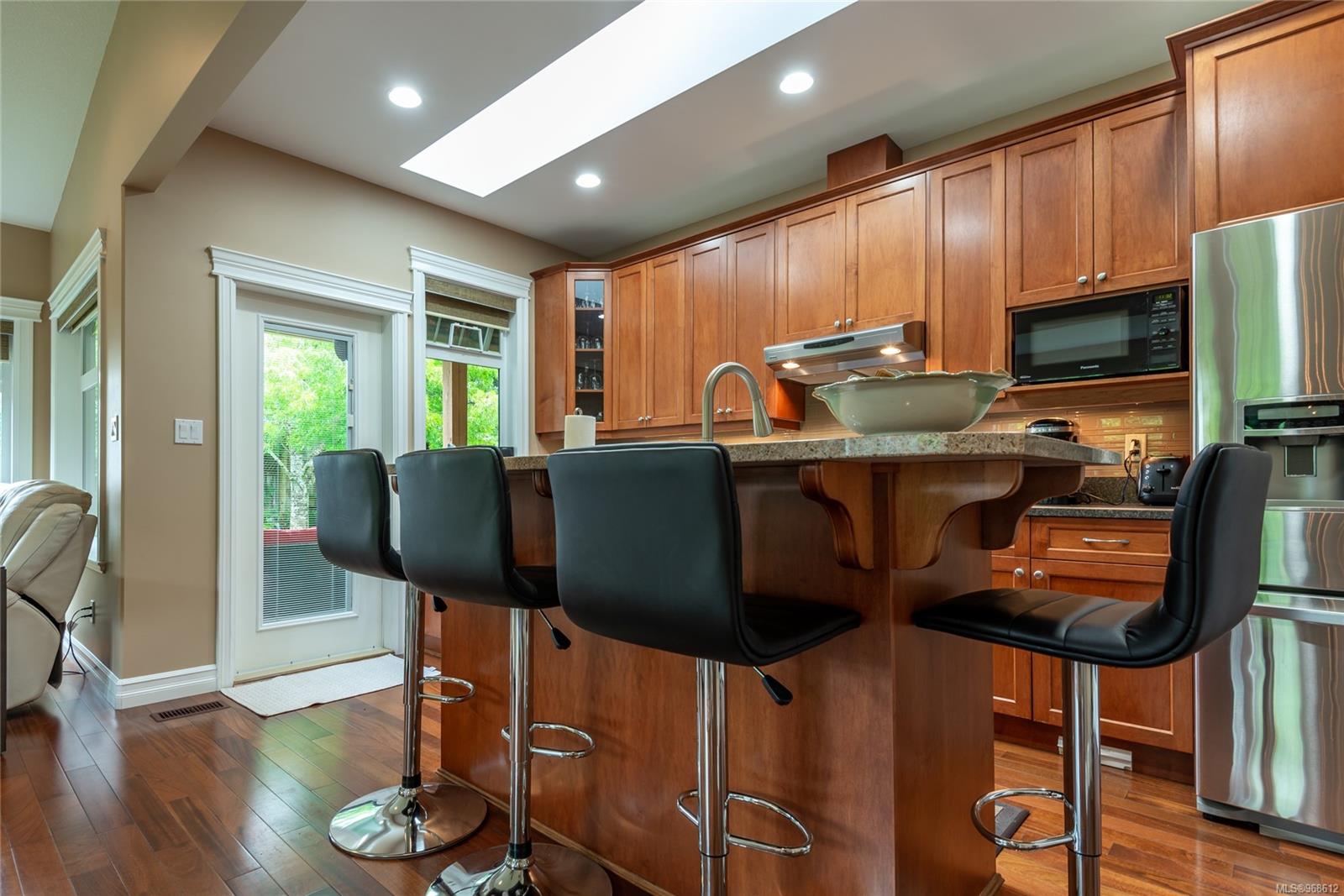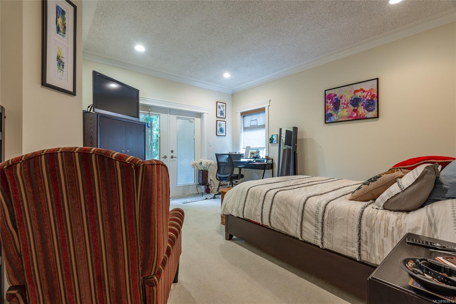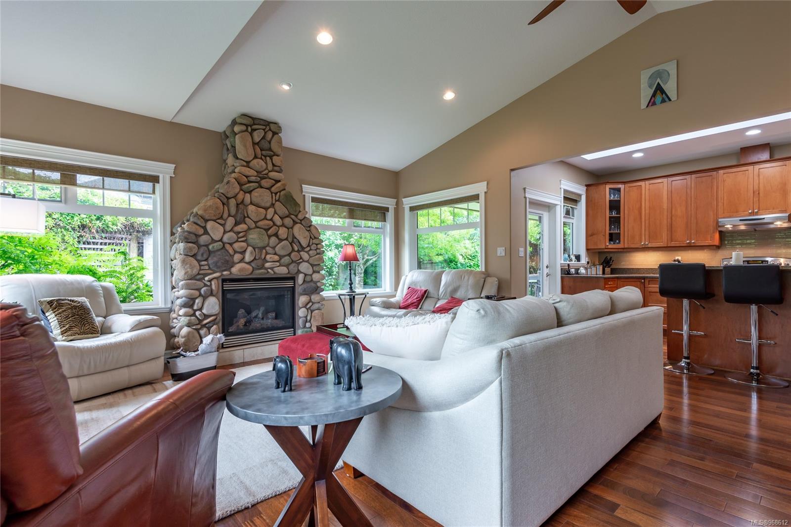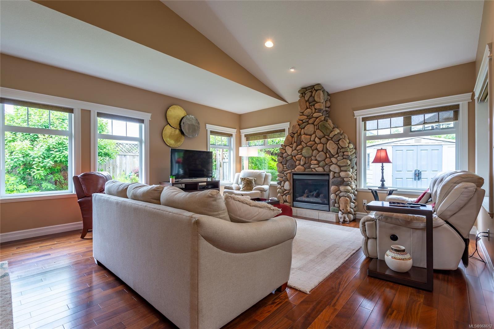 Welcome to Maryland Estates. This ranch-style home seamlessly integrates indoor and outdoor living. Large windows flood the interior in natural light, offering serene views of the private backyard adorned with mature gardens. The master bedroom is a retreat with french doors leading to a private patio featuring a hot tub. Inside, you’ll find beautiful hardwood flooring enhancing the open concept kitchen, dining area, and living room, complemented by a striking floor-to-ceiling rock gas fireplace. The gourmet kitchen is a chef’s delight, featuring granite countertops, ambient over and under counter lighting, ample cupboard space, and a convenient walk-in pantry. Additional highlights include an extra-large double garage and storage in an easily accessible crawl space. gas bbq hook up on the patio, sprinkler system, heat pump and built-in vacuum. Designed for accessibility, this level entry rancher is a must see!
