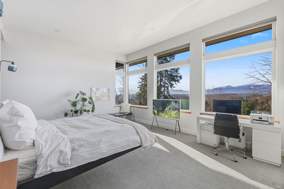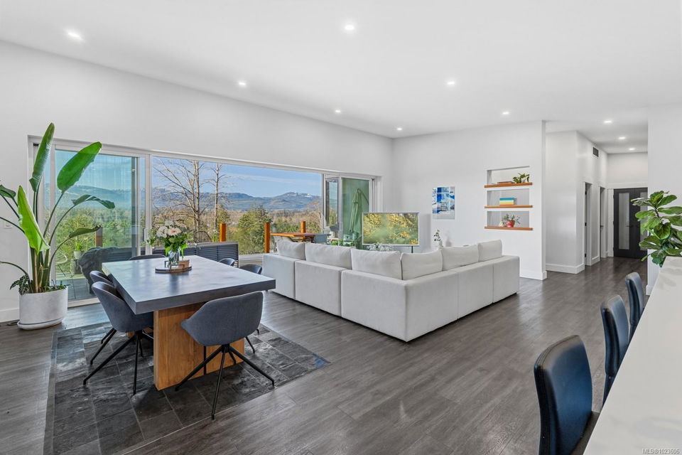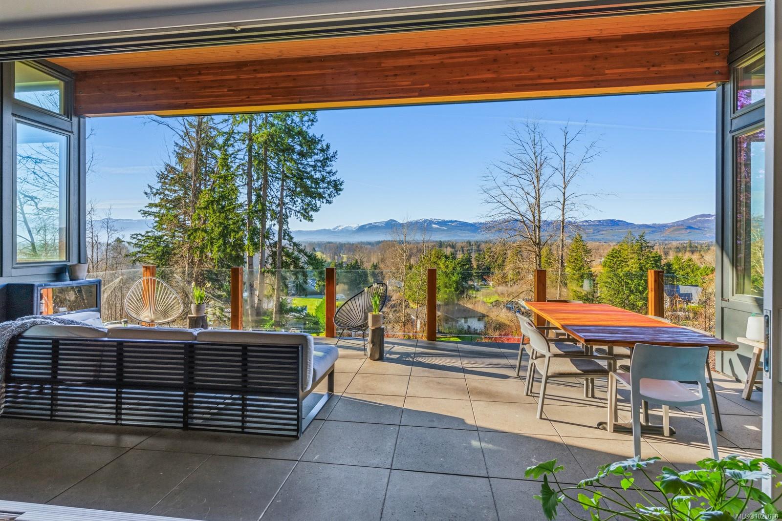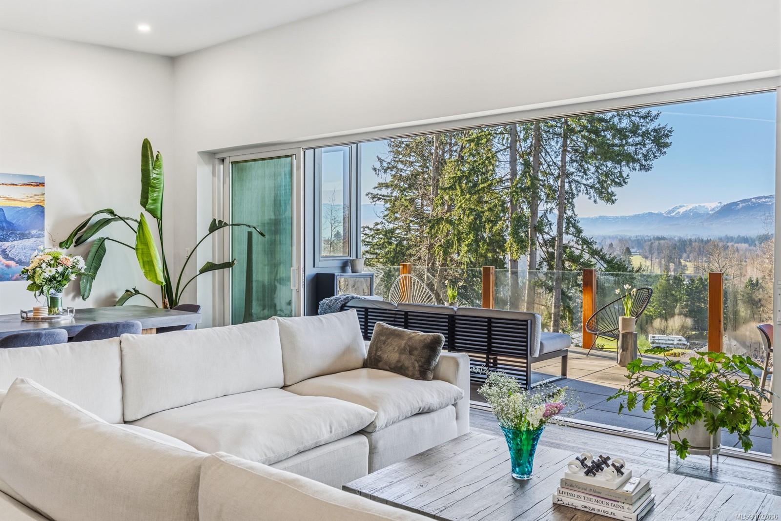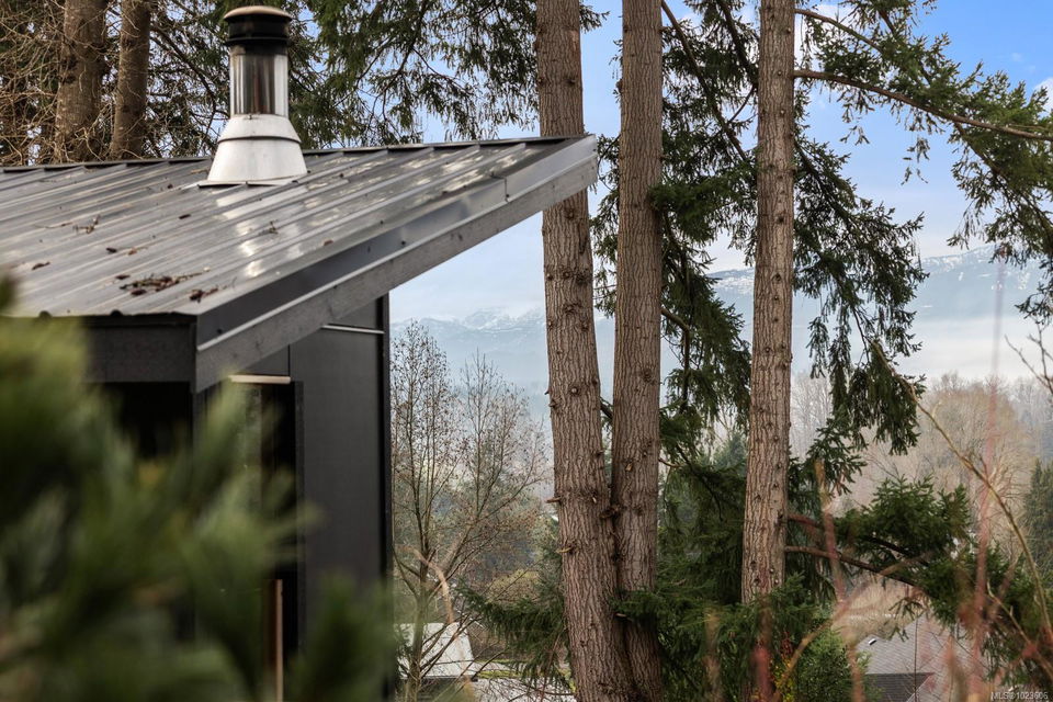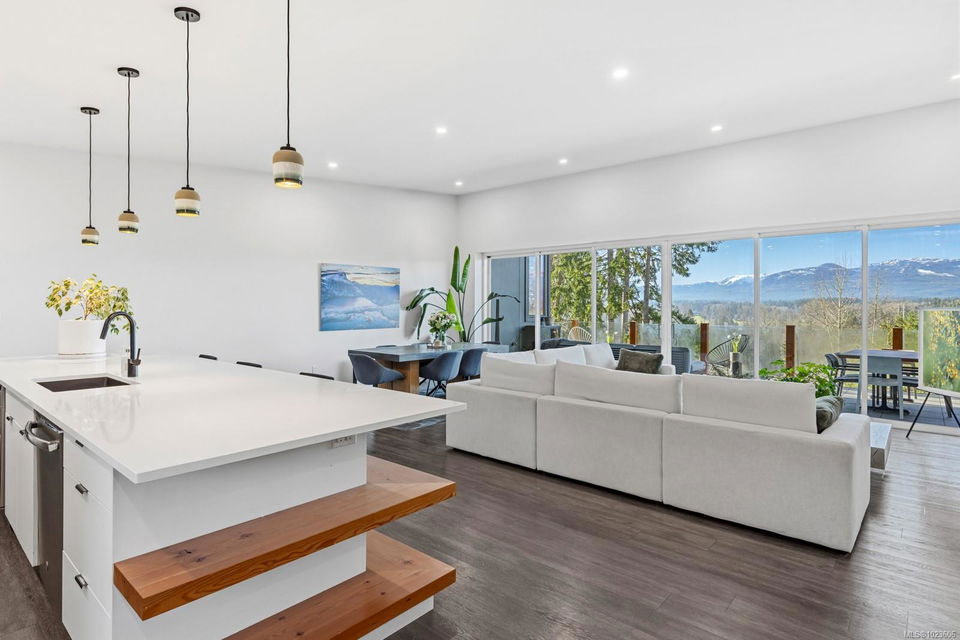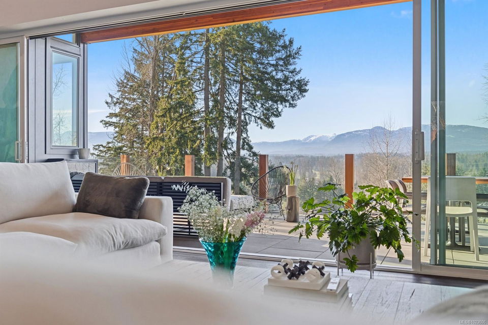 The most beautiful view awaits. This stunning 3-bedroom, 2-bath home is designed to capture breathtaking southwest-facing views of the Comox Glacier and Beaufort Mountain Range, with afternoon sun and unforgettable sunsets. Seamless indoor-outdoor living defines the main living space, where stacking sliding glass doors open wide—perfect for entertaining or relaxing while taking in the scenery. The spacious primary suite offers incredible views, a beautiful ensuite, large walk-in closet, and a floating bed. A massive garage with wood stove and overhead lift provides exceptional versatility for projects, storage, or hobbies. The matching 8-10 person sauna adds an element of wellness for family and guests. Set on a private 1-acre property across three levels, this home is located within the Montessori school catchment, with all levels of schooling—so close to all amenities, yet far enough out of town to enjoy space, comfort, and privacy.