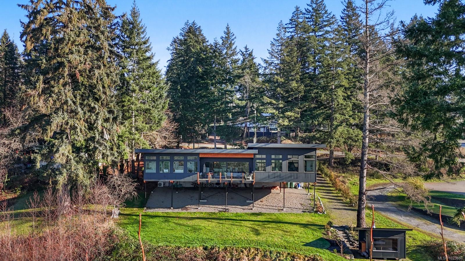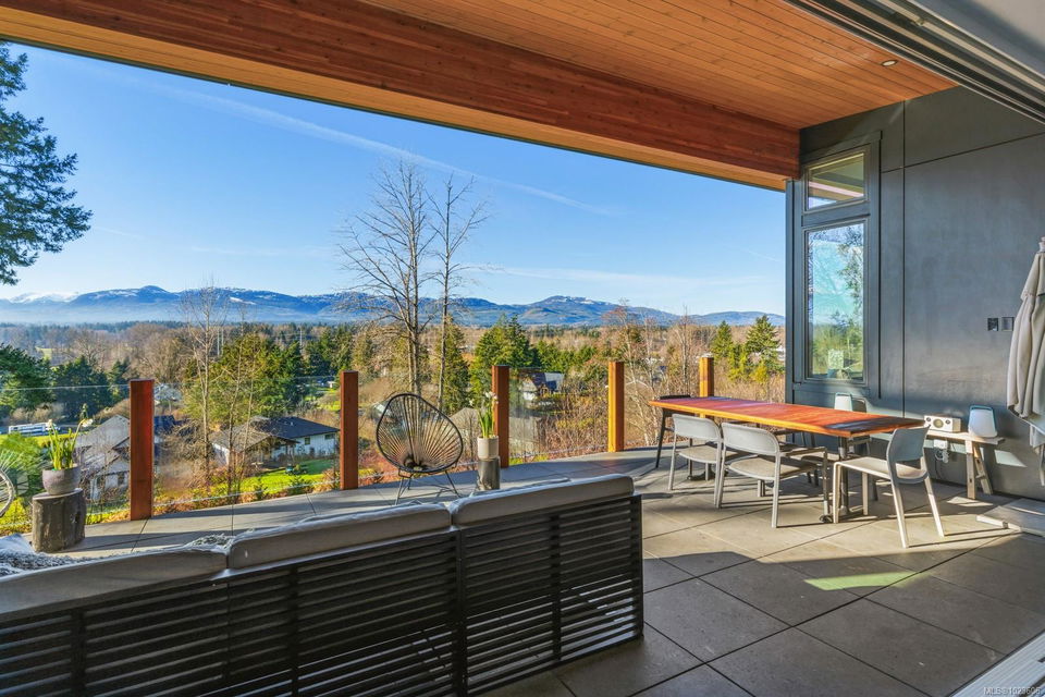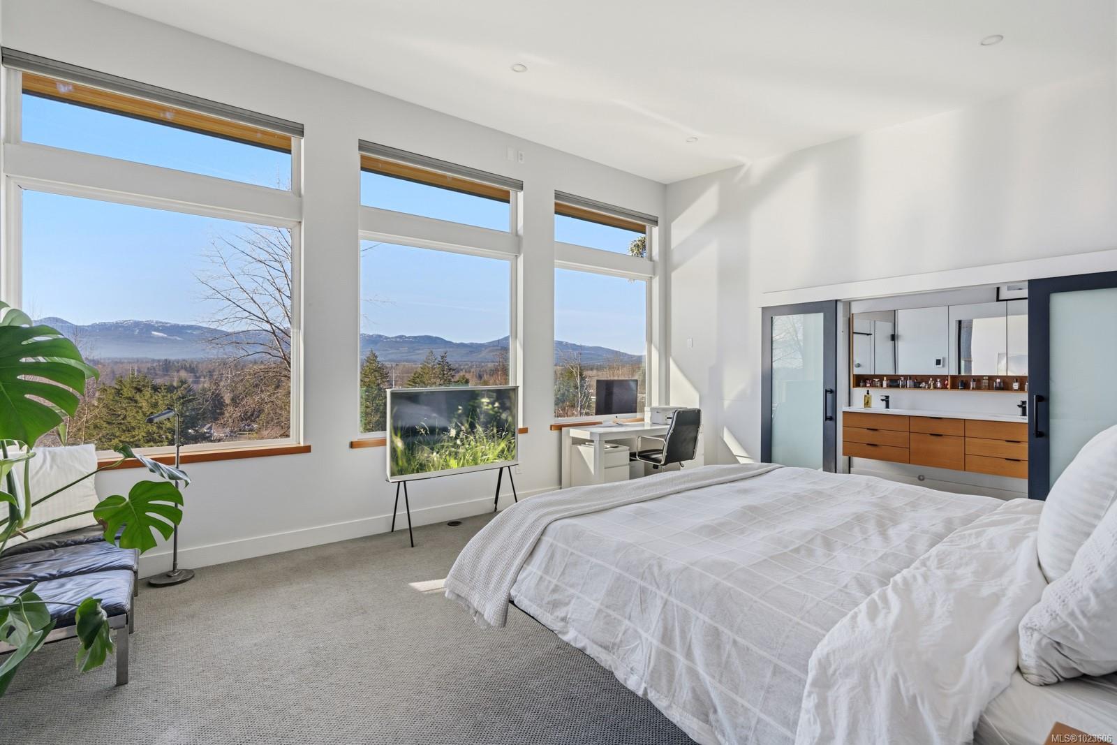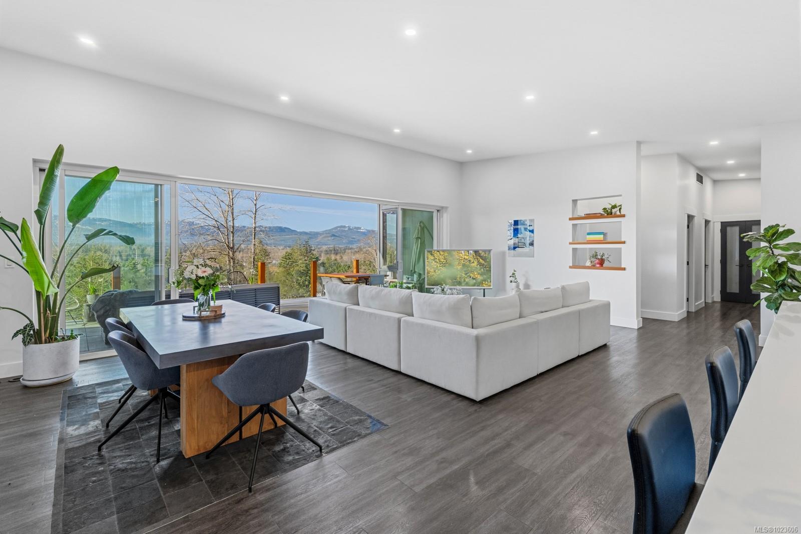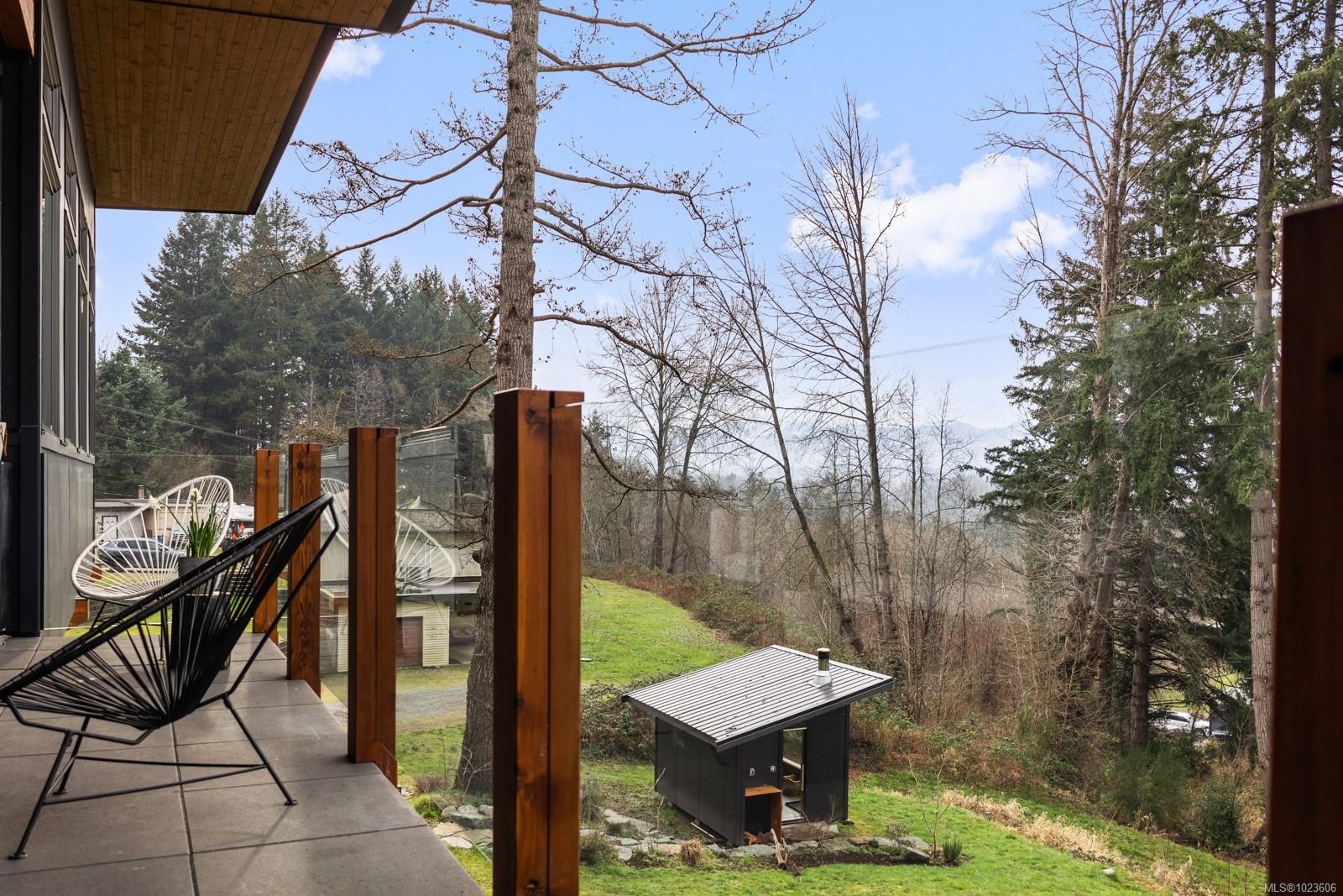 The most beautiful view awaits. This stunning 3-bedroom, 2-bath home is designed to capture breathtaking southwest-facing views of the Comox Glacier and Beaufort Mountain Range, with afternoon sun and unforgettable sunsets. Seamless indoor-outdoor living defines the main living space, where stacking sliding glass doors open wide—perfect for entertaining or relaxing while taking in the scenery. The spacious primary suite offers incredible views, a beautiful ensuite, large walk-in closet, and a floating bed. A massive garage with wood stove and overhead lift provides exceptional versatility for projects, storage, or hobbies. The matching 8-10 person sauna adds an element of wellness for family and guests. Set on a private 1-acre property across three levels, this home is located within the Montessori school catchment, with all levels of schooling—so close to all amenities, yet far enough out of town to enjoy space, comfort, and privacy.